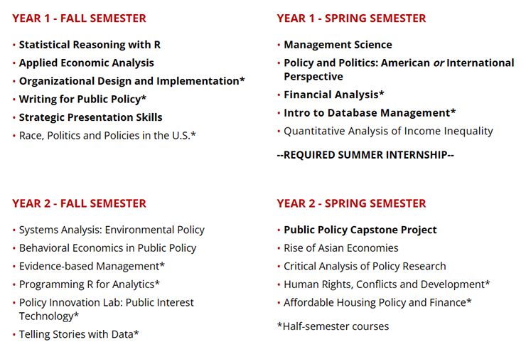 学生将在匹兹堡完成第一年数据分析和管理策略的学习,在第二年,学生将前往美国政治中心华盛顿特区实地开展实际工作,同时完成颇具挑战性的政策分析和方法课程的学习。