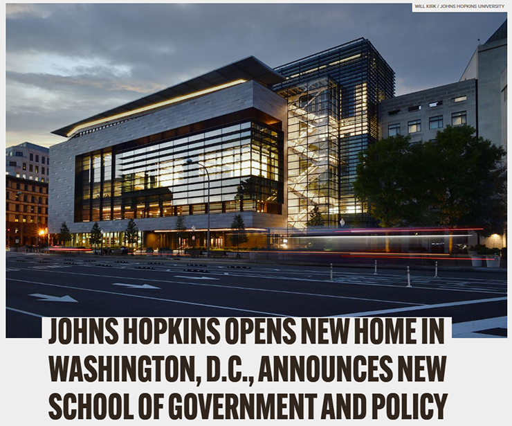 约翰霍普金斯大学宣布,将在华盛顿特区(DC)校区再开设一个新学院——政府与政策学院(School of Government and Policy)。