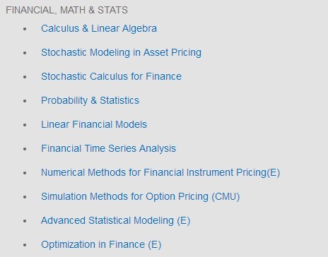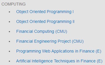 选修课主要包括两方面:高级方法(金融数据分析、金融工程中的计算方法)和特定专题(利率期限模型与固定收益证券、大宗商品市场、信用风险模型与产品、 算法交易)