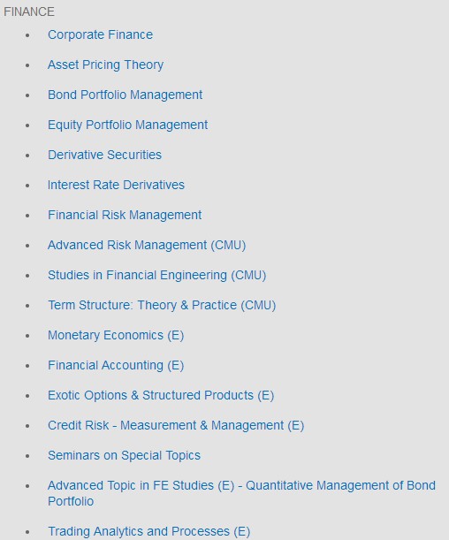 NTU MFE 项目为期一年,分三个大学期,课程包括20门核心课程和4门选修课程,分三大类:(E代表选修课程)
